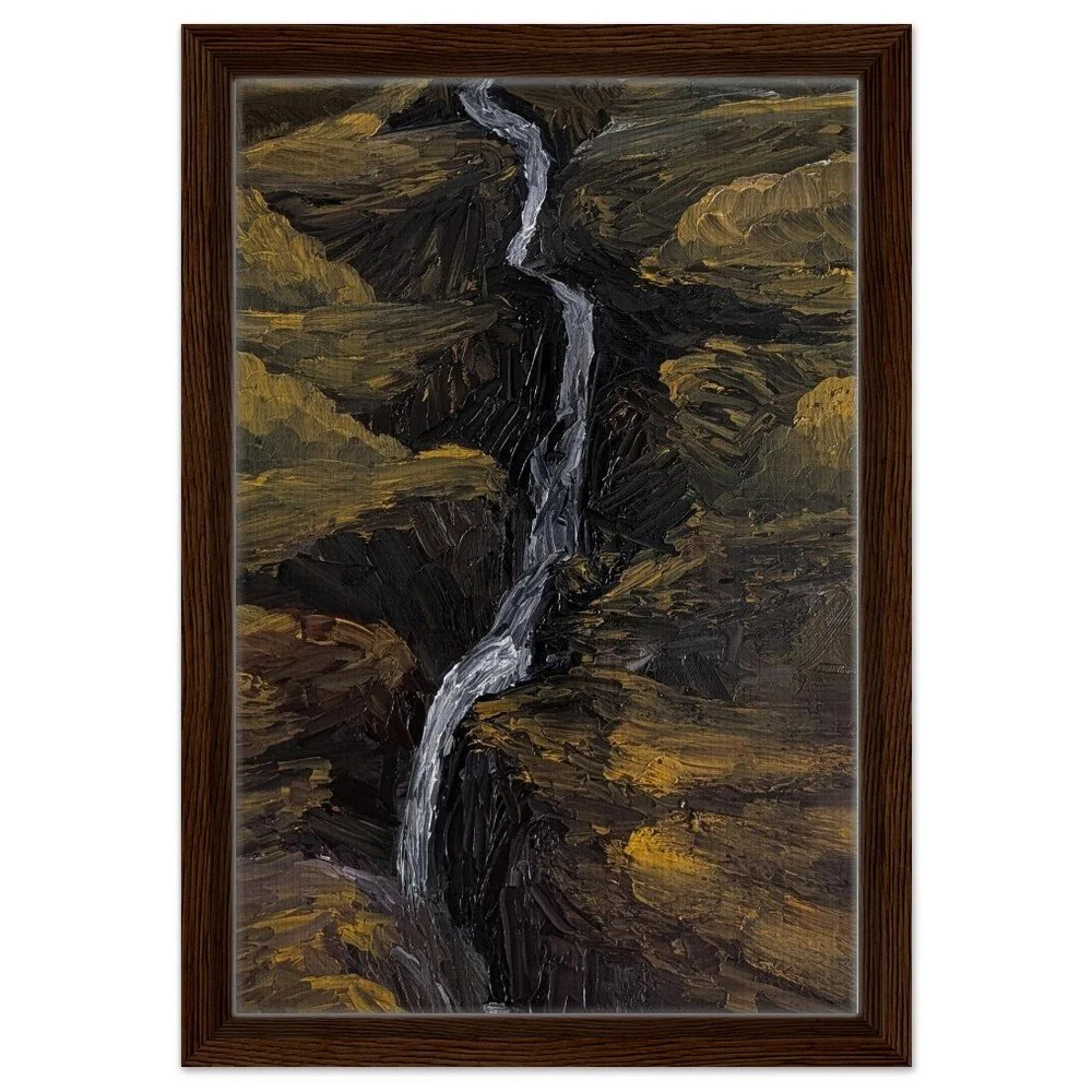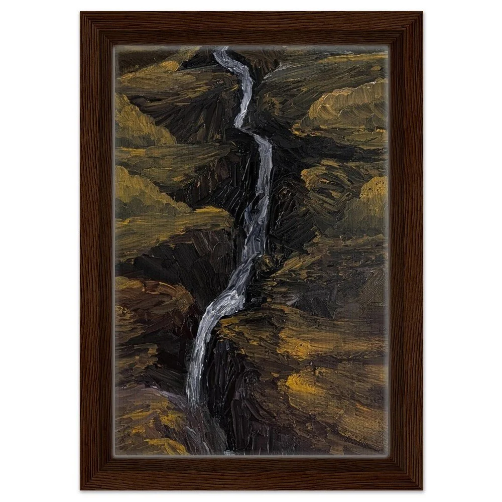 Immerse yourself in the rugged calm of the White Mountains with this original abstract landscape painting of Gibbs Falls. Echoing Robert Frost’s sentiment, "The woods are lovely, dark and deep," this piece captures the quiet intensity of the forest path. Featuring thick, expressive impasto brushwork, it defines the vertical movement of water and mossy stones with a tactile energy that creates a physical terrain. The monochromatic palette of deep mossy greens and stony grays, highlighted by stark, bright cascades, offers a space designed for reflection and a tribute to regional authenticity. Printed on FSC-certified canvas with a premium wood frame (available in Black, Natural Wood, or Dark Brown), this artwork adds profound depth to any space. Celebrate New Hampshire's enduring beauty. Available in 13 sizes worldwide. Includes a hanging kit for effortless installation. Experience art that grounds you.