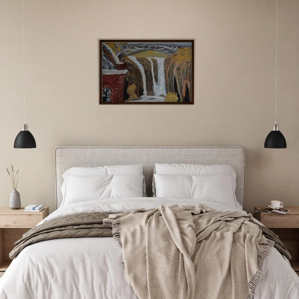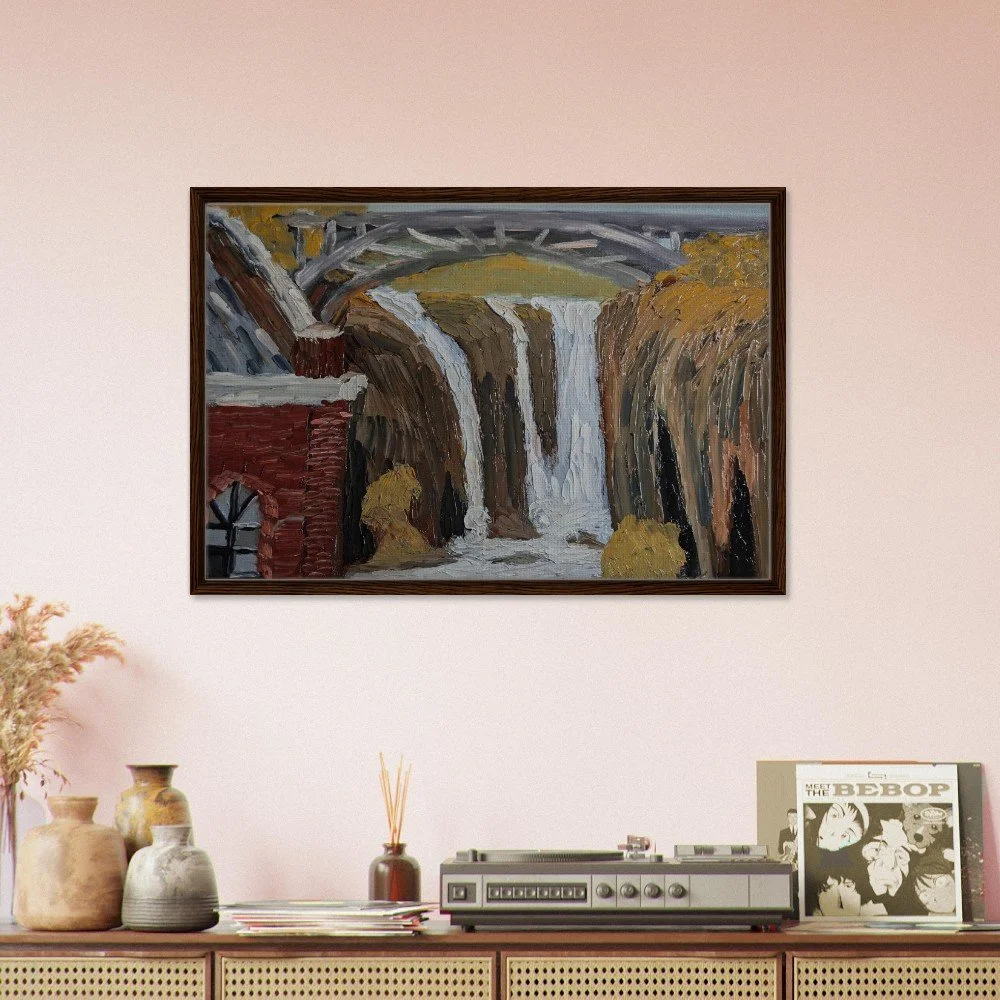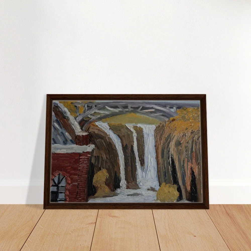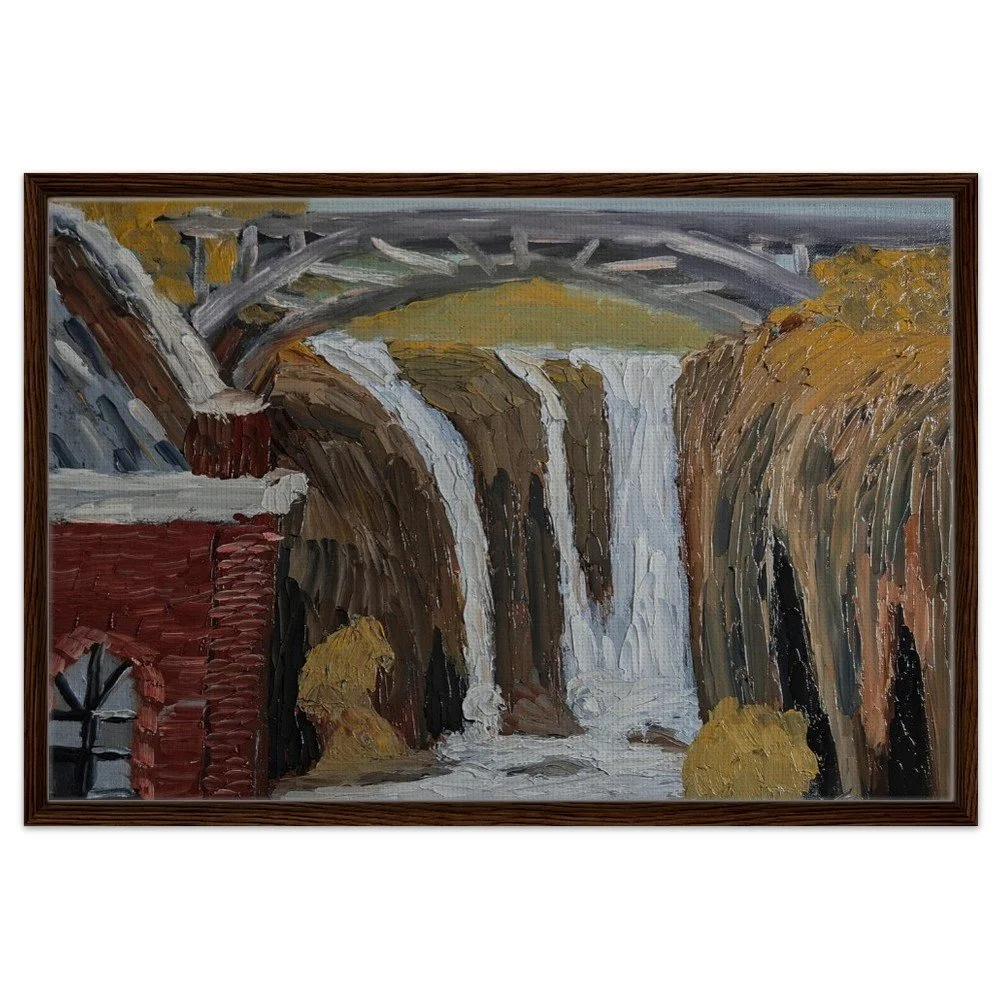 Bring the raw beauty of Paterson's Great Falls into your home with this unique, custom-painted framed canvas. Featuring the iconic industrial pump house in the foreground, this original oil painting boasts a heavy impasto texture that creates stunning depth and visual interest. Each piece is printed on premium cotton-polyester blend canvas (300-350gsm) stretched over FSC-certified wood. Choose from three frame colors – Black, Natural Wood, or Dark Brown – and available in 13 sizes. Our high-quality printing ensures vibrant, long-lasting colors. Ready to hang with an included kit. Perfect for art lovers and history buffs seeking distinctive home decor. Embrace artisanal quality and order your one-of-a-kind piece today!