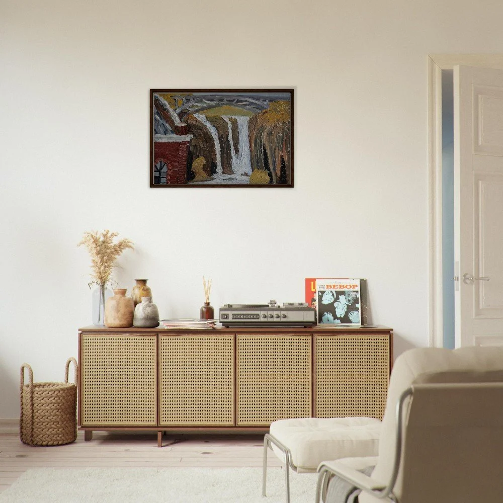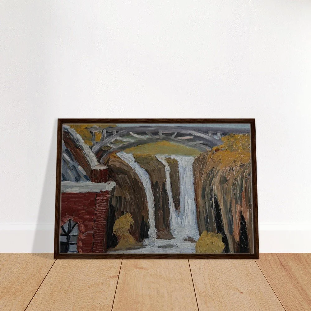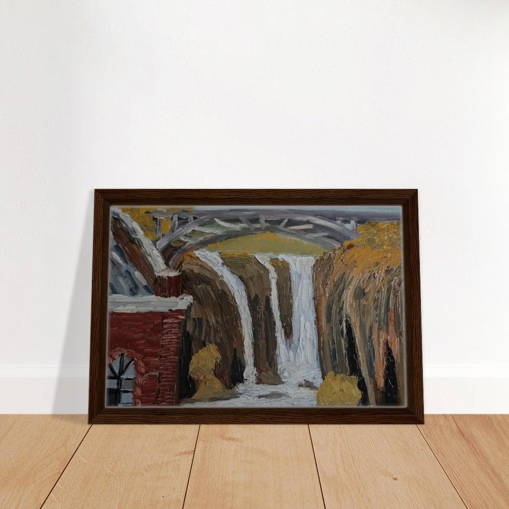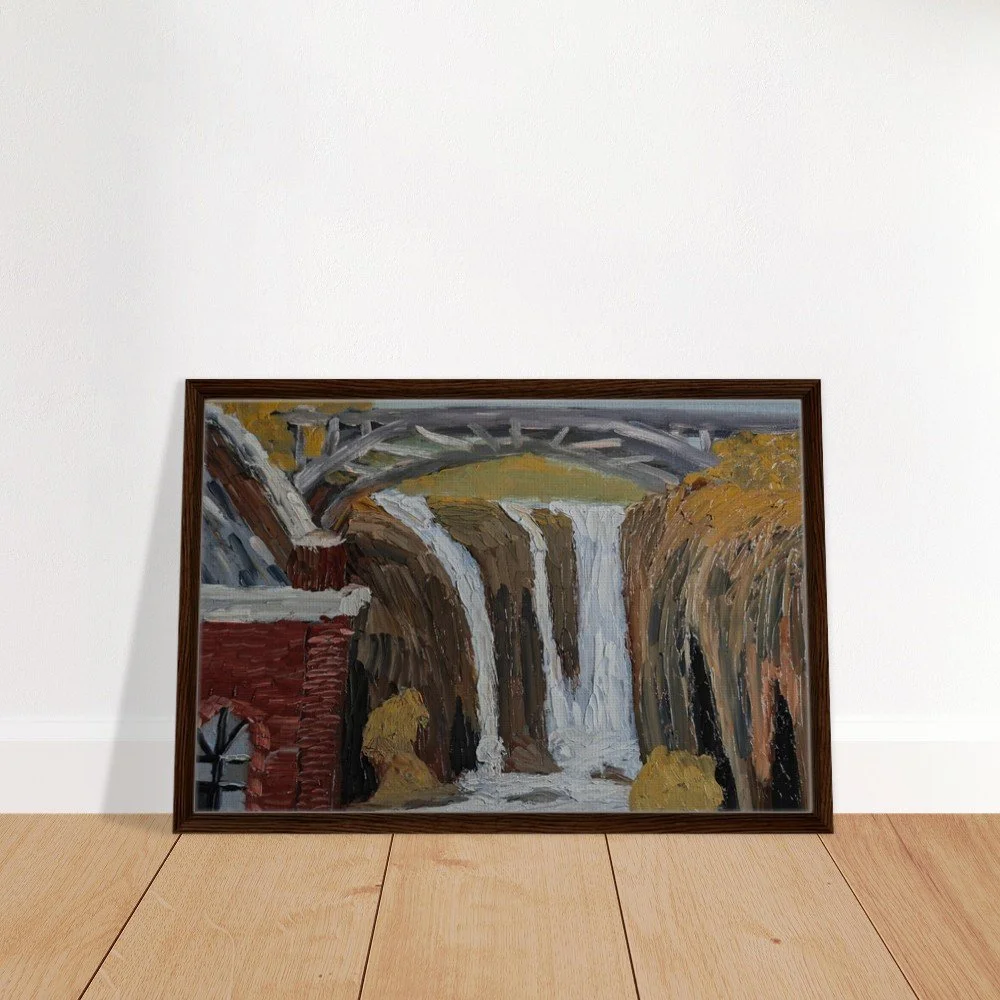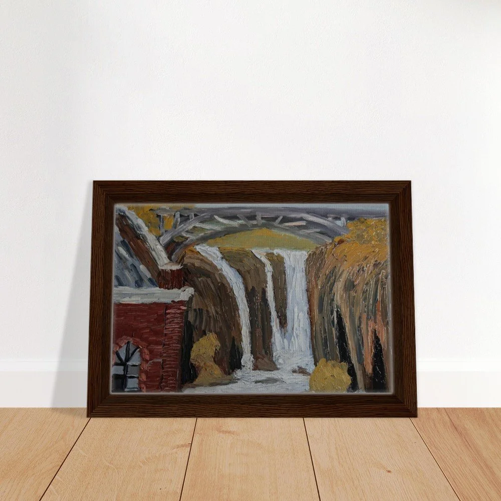 Bring the raw beauty of Paterson's Great Falls into your home with this unique, custom-painted framed canvas. Featuring the iconic industrial pump house in the foreground, this original oil painting boasts a heavy impasto texture that creates stunning depth and visual interest. Each piece is printed on premium cotton-polyester blend canvas (300-350gsm) stretched over FSC-certified wood. Choose from three frame colors – Black, Natural Wood, or Dark Brown – and available in 13 sizes. Our high-quality printing ensures vibrant, long-lasting colors. Ready to hang with an included kit. Perfect for art lovers and history buffs seeking distinctive home decor. Embrace artisanal quality and order your one-of-a-kind piece today!