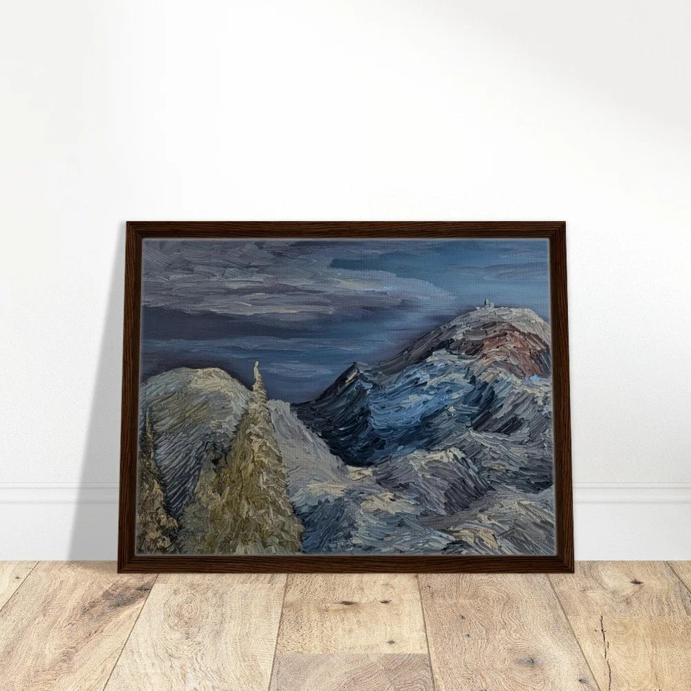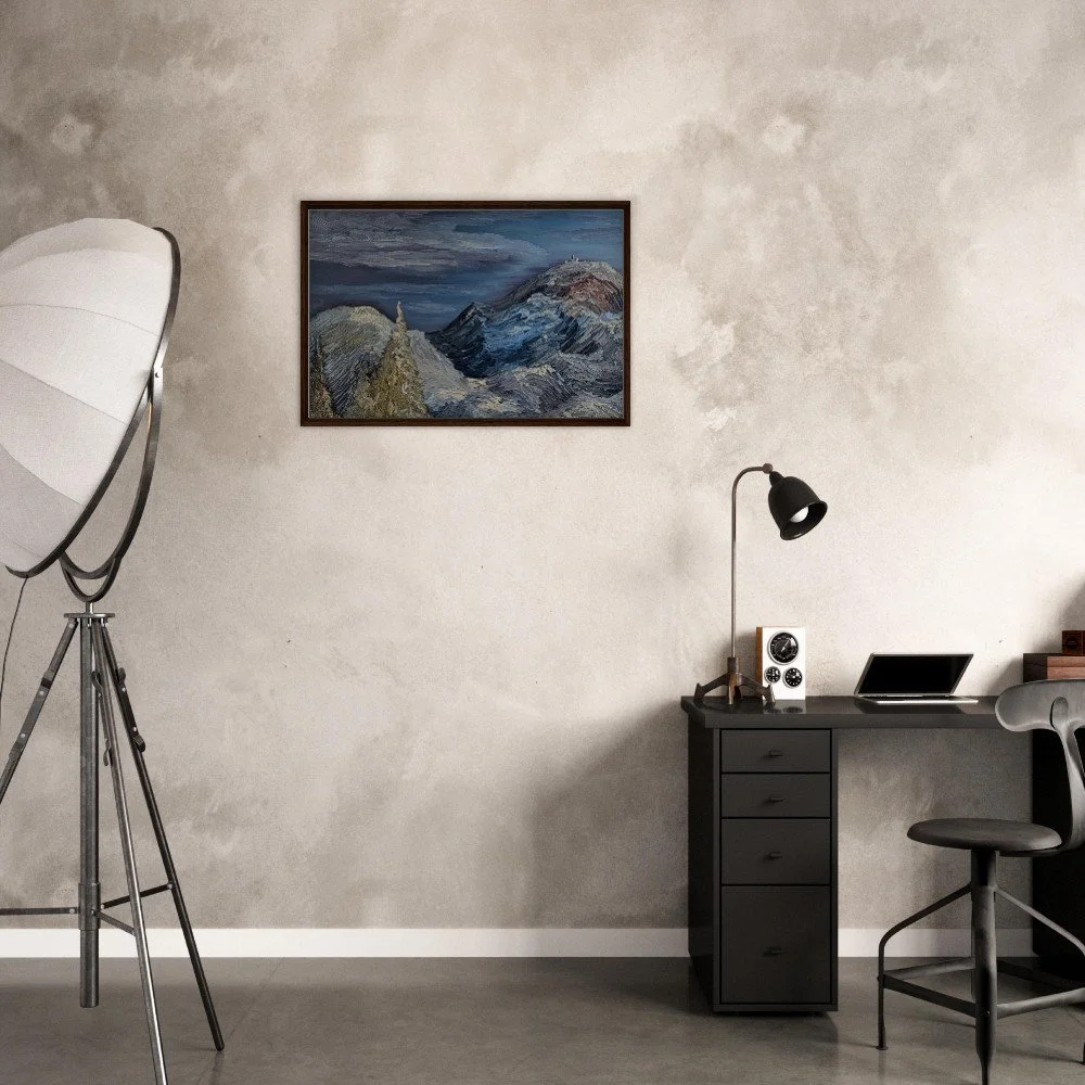 Discover the rugged calm of New Hampshire’s Presidential Range with this original panoramic landscape painting. Capturing the quiet intensity of Mt. Eisenhower and Mt. Washington, this artwork features thick, expressive brushwork and impasto techniques, creating a physical terrain of ridges and peaks. The monochromatic palette of earthy browns, stony grays, and deep shadows evokes a sense of grounding and regional authenticity, transforming your space into a haven for reflection. Echoing Robert Frost's sentiment, "I took the one less traveled by, and that has made all the difference," this piece offers a professional-grade connection to the iconic landscape. Available in multiple sizes and frame options (Black, Natural Wood, Dark Brown) with FSC-certified wood, this minimalist artwork brings depth and soul to any modern interior. Printed and shipped on demand.